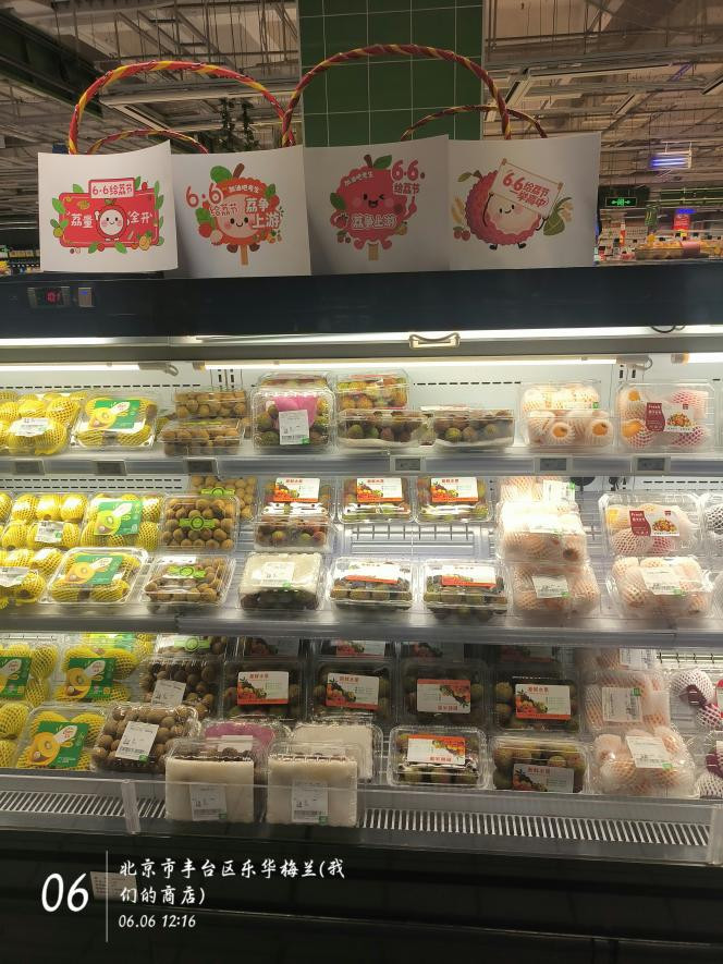 北京市丰台区的商店货架上摆放着荔枝,“6·6给‘荔’节”的宣传物料显眼。